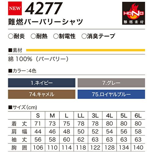 他の画像を見る 難燃薄手シャツ シャツ 作業服 作業着 トップス 長袖 村上被服 鳳皇 HOOH HONO 4277 綿100 コットン 春夏 難燃 燃えにくい 耐炎 耐熱 溶接 工場 作業現場 夏用 薄手 ユニフォーム メンズ おしゃれ かっこいい 無地 ワーク ウェア アウトドア バーベキュー BBQ JIS規格適合 ISO規格適合 特別価格 ¥ 5,500 税込 〜 特別価格 ¥ 税込 HONOブランドの難燃(防炎)シャツは、耐炎・耐熱・静電性に優れた、やわらかく肌触りのよい難燃(防炎)素材を採用! 日本防炎協会が定める耐炎・耐熱・帯電基準をクリア―した安全性。火を扱う溶接作業や工場、作業現場など働く人を安全にサポートする、燃えにくい夏用綿100%素材の難燃作業着です。 詳細を見る お気に入りに登録する