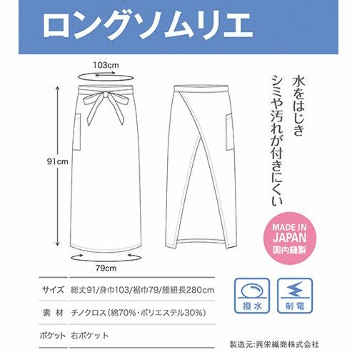 熱に強く、水をはじく、人気の定番スタイル。ポケットは右に1つ付いています。しっかりとした厚みとコットンの質感にあふれたロングソムリエです。