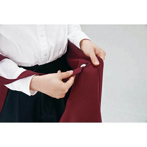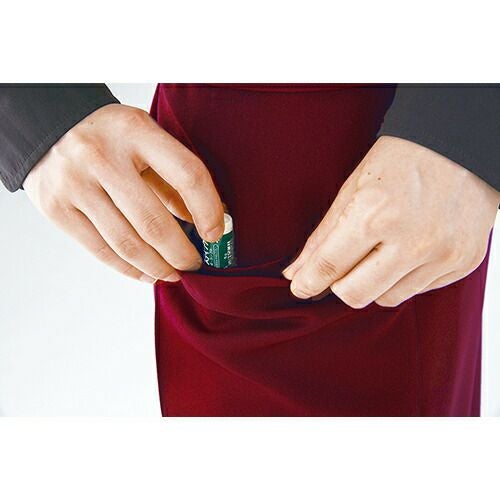 内側のひも通し穴に腰ひもを通して結ぶと、後ろ姿がきれいに見え、腰回りも安定します。ポケットはマチ付きポケットが左右に各1つ、右には便利な小物ポケット付きです。しなやかな質感と縦向きに伸縮性があるので、しゃがんでも窮屈感がありません。食品汚れなどをはじき、落ちやすくする防汚効果と漂白剤による脱色を防ぐW効果で色あせや色落ちを防ぎます。