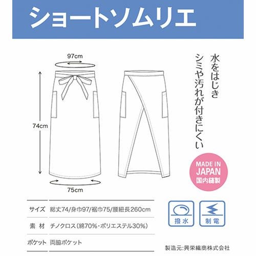 熱に強く、水をはじく、人気の定番スタイル。ポケットは左右に1つ付いています。しっかりとした厚みとコットンの質感にあふれたショートソムリエです。