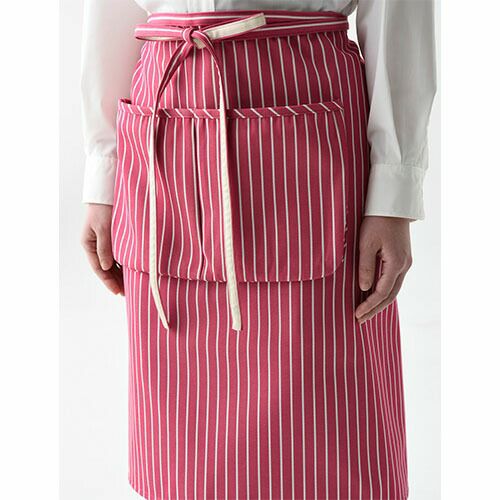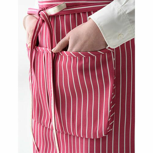 上品なストライプ巾の クラフト感あふれるエプロン。ワークウェアの定番生地を現代風に「ヒッコリーストライプエプロン」 「ヒッコリーストライプエプロン」は、労働着の大定番素材・ヒッコリー生地に、化学繊維で上品なテイストを加味し現代風にリニューアルしたエプロン。ポリエステル高混率にすることで耐久性・洗濯性を高め、薄く軽く上品な雰囲気に。クラフト感あふれるエプロンは、手づくりやナチュラルをテーマとしたお店・職場にうってつけです。「胸当エプロン」は肩紐と腰紐の裏側に、「腰下エプロン」は腰紐の裏側に別布テープを施し、結び目が滑りにくく、またデザイン的なアクセントとしています。バックの腰紐通しホールで紐がズレず、すっきりと綺麗に着用できます。腹部に2段・計3つのポケット、右腰にはペン差しや布巾掛けとして使えるループが有り機能的です。