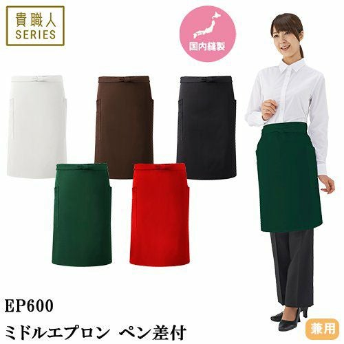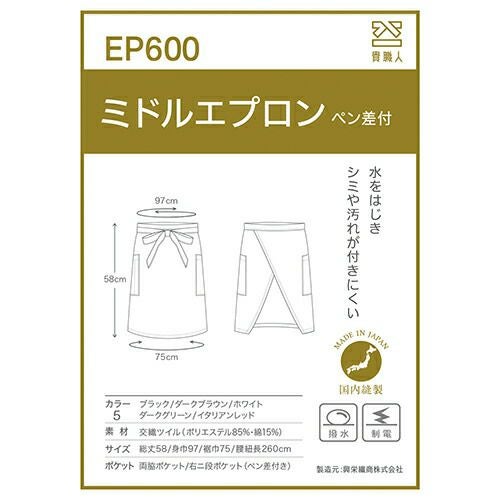 他の画像を見る 【メール便対応】エプロン 前掛 制服 ユニフォーム ミドル丈 興栄繊商 KOEI ミドルエプロン ペン差付 EP600-BK、EP600-BR、EP600-WH、EP600-GR、EP600-RE 飲食店 ユニフォーム カフェ レストラン バー 居酒屋 ソムリエ おしゃれ かわいい 可愛い かっこいい業務用 シンプル 定番 特別価格 ¥ 2,200 税込 丈夫でシワになりにくい機能的なミドルエプロン 丈夫でシワになりにくい、機能的なミドルエプロン。ポケットは左右に各1つ、右はペン差しと小口ポケットが付いた2段ポケットです。しっかりとした質感で動きやすさ、使いやすさともに快適です。 詳細を見る お気に入りに登録する