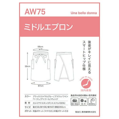 他の画像を見る 【メール便対応】エプロン 前掛 制服 ユニフォーム ミドル丈 興栄繊商 KOEI ミドルエプロン AW75-BK、AW75-BU、AW75-BR、AW75-WI、AW75-BE、AW75-CH、AW75-OR 飲食店 ユニフォーム カフェ レストラン バー 居酒屋 ソムリエ おしゃれ かわいい 可愛い かっこいい業務用 シンプル 定番 特別価格 ¥ 2,673 税込 食品汚れ、漂白剤に強い後ろ姿がきれいなミドルエプロン 内側のひも通し穴に腰ひもを通して結ぶと、後ろ姿がきれいに見え、腰回りも安定します。ポケットはマチ付きポケットが左右に各1つ、右には便利な小物ポケット付きです。しなやかな質感が体にフィットして快適な着心地です。食品汚れなどをはじき、落ちやすくする防汚効果と漂白剤による脱色を防ぐW効果で色あせや色落ちを防ぎます。 詳細を見る お気に入りに登録する