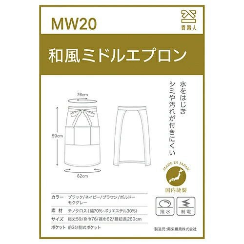 他の画像を見る 【メール便対応】エプロン 前掛 制服 ユニフォーム ミドル丈 興栄繊商 KOEI 和風ミドルエプロン MW20-BK、MW20-NB、MW20-BR、MW20-BD、MW20-GY 飲食店 ユニフォーム カフェ レストラン バー 居酒屋 ソムリエ おしゃれ かわいい 可愛い かっこいい業務用 シンプル 定番 特別価格 ¥ 2,413 税込 しっかりとした厚み。高級感漂う和風エプロン しっかりとした厚みで高級感のある和風スタイルを演出。中央に3分割された大きめのポケットは、ほころびやすい箇所をカン止めで補強しています。熱にも強く、コットンの質感にあふれた和風エプロンです。 詳細を見る お気に入りに登録する