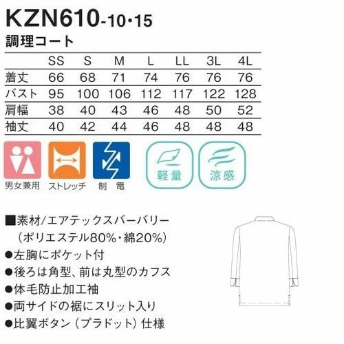 他の画像を見る 制服 ユニフォーム シェフ コックコート KAZEN カゼン 調理コート KZN616-10、KZN616-15 飲食店 厨房服 調理服 レストラン フレンチ イタリアン 中華 おしゃれ かっこいい プロ仕様 ストレッチ 伸縮性 吸汗 快適 制電 特別価格 ¥ 6,034 税込 メッシュ素材が内蔵されたアクションプリーツ付で動きやすさと通気性の良さを両立。 詳細を見る お気に入りに登録する
