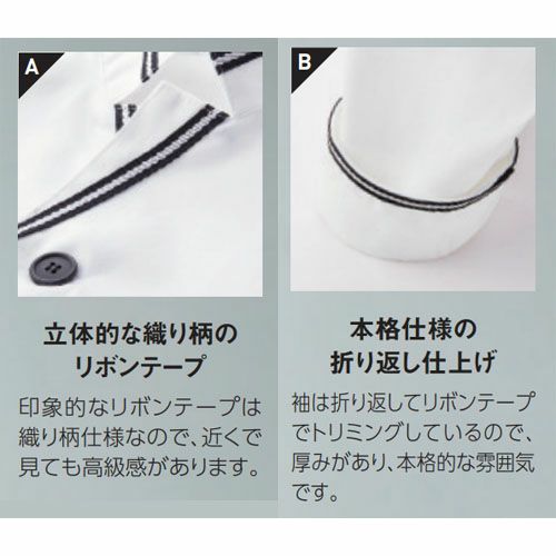 他の画像を見る 制服 ユニフォーム シェフ ET1342 ET1343 サーヴォ Servo 7分袖 快適 清潔 飲食店 厨房服 調理服 レストラン フレンチ イタリアン 中華 おしゃれ かっこいい プロ仕様 ショート丈 モダン 女性用 レディース ショップコート 特別価格 ¥ 5,293 税込 エプロンの上に出して着るショート丈のスッキリモダンなデザイン エプロンの上に出して着られるようショート丈に仕立てにしたスマートフォルムの女性用ショップコート。立体的な織り柄のリボンテープはブラック・グリーン・ワインの3色展開。 詳細を見る お気に入りに登録する