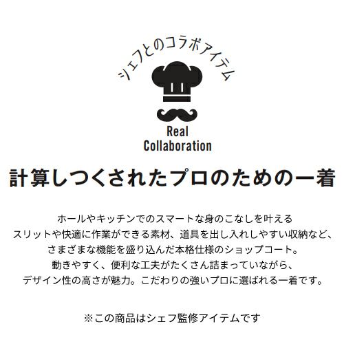 他の画像を見る 制服 ユニフォーム シェフ SJAU-1812 サーヴォ Servo 7分袖 快適 清潔 飲食店 厨房服 調理服 レストラン フレンチ イタリアン 中華 おしゃれ かっこいい プロ仕様 白 黒 ショップコート 特別価格 ¥ 6,008 税込 ホールやキッチンで快適に作業ができる本格仕様 計算しつくされたプロのための一着ホールやキッチンでのスマートな身のこなしを叶えるスリットや快適に作業ができる素材、道具を出し入れしやすい収納など、さまざまな機能を盛り込んだ本格仕様のショップコート。動きやすく、便利な工夫がたくさん詰まっていながら、デザイン性の高さが魅力。こだわりの強いプロに選ばれる一着です。 詳細を見る お気に入りに登録する