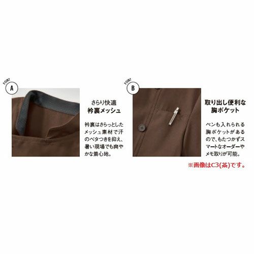 他の画像を見る 制服 ユニフォーム シェフ SJAU-1813 サーヴォ Servo 7分袖 快適 清潔 飲食店 厨房服 調理服 レストラン フレンチ イタリアン 中華 おしゃれ かっこいい プロ仕様 シック 黒 茶 ショップコート 特別価格 ¥ 5,156 税込 落ち着いたカラーでシックなイメージ。耐久性のある素材も人気 シックな色合いの七分袖のショップコート。衿裏にメッシュ素材を使用し、汗のベタつきを抑えます。 詳細を見る お気に入りに登録する