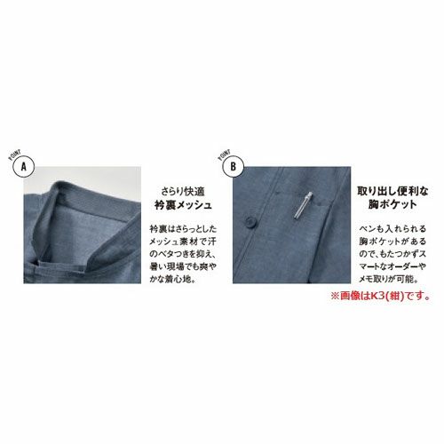 他の画像を見る 制服 ユニフォーム シェフ サーヴォ Servo ショップコート AD0601 飲食店 厨房服 調理服 レストラン フレンチ イタリアン 中華 おしゃれ かっこいい プロ仕様7分袖 快適 清潔 特別価格 ¥ 4,606 税込 涼やかに、 風ぬける──繊維メーカーがその技術を結集し、開発した高通気快適素材を使用。 生地にたくさんの通気孔があり、通気性に特化しているため快適な着心地が持続します。デザインはスタンドカラーと襟付きの2タイプ、3色展開でご用意。お店の雰囲気に合わせて選べます。 詳細を見る お気に入りに登録する