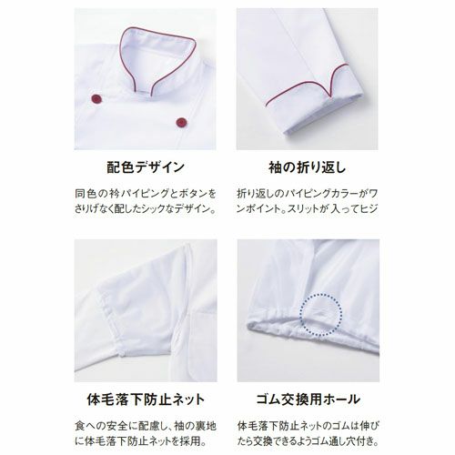 他の画像を見る 制服 ユニフォーム シェフ SJAU-2008 サーヴォ Servo 7分袖 快適 清潔 飲食店 厨房服 調理服 レストラン フレンチ イタリアン 中華 おしゃれ かっこいい プロ仕様 白 ショップコート 特別価格 ¥ 5,912 税込 白地にアクセントカラーをONした、抗ウイルス加工付きショップコート 釦とパイピングが濃色の配色でアクセントになっています。ジャンルを選ばず様々な飲食店のキッチンやホールで使えるデザイン、動きやすい裾のスリットや小物を入れられる胸ポケットなど快適に仕事ができる工夫が盛りだくさんです。 詳細を見る お気に入りに登録する