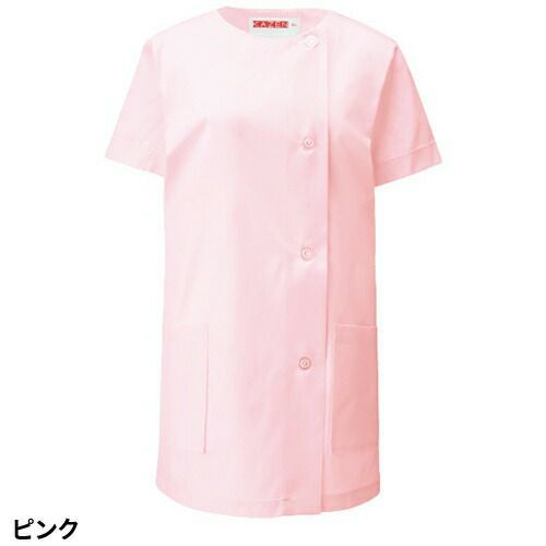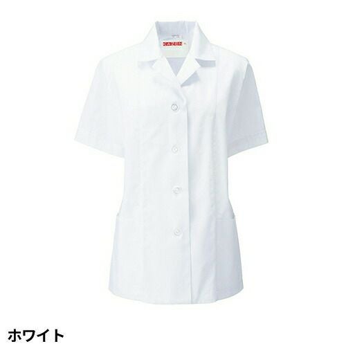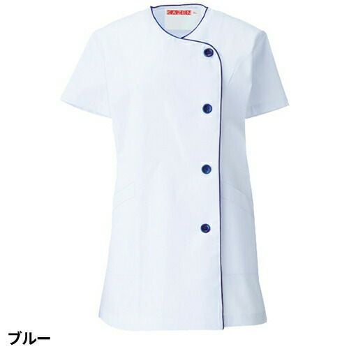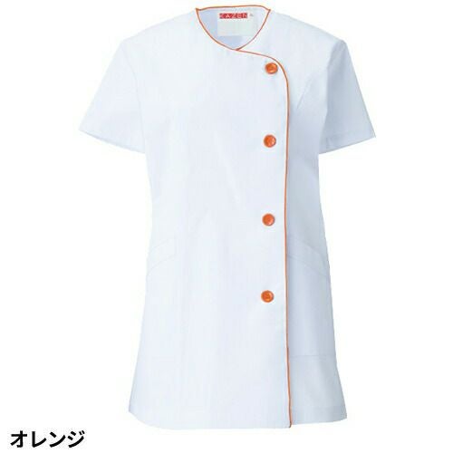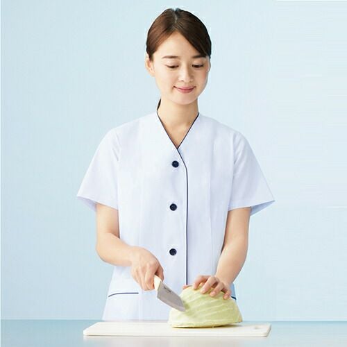 縁取りのラインとカラーボタンがおしゃれでかわいい 純白に変化をつけたデザインで、女性らしさと清潔感両方を演出しました。V衿タイプで衿元はスッキリしていて、素材はしなやかで上品な風合いがあるブロードを使用しています。O-157対応制菌加工済み。