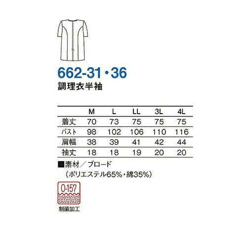 異物混入防止機能をアップ 袖は作業しやすい七分袖で、体毛防止加工袖付き。ファスナー仕様で着脱簡単、やさしい色づかいが職場を明るくします。第一ボタンはテーピースナッパーで、比翼ファスナーという仕様となっております。