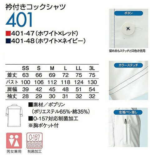 他の画像を見る 制服 ユニフォーム KAZEN カゼン コックシャツ 401-47・48 五分袖 飲食店 シェフ 接客 厨房服 調理服 男女兼用 レストラン カフェ ベーカリー パン屋 パティシエ 中華 おしゃれ かわいい かっこいい プロ仕様 制菌 吸汗 特別価格 ¥ 4,551 税込 清潔感のあるワイドカラーのシャツ 色ステッチとボタンをアクセントにした一着。ボタンの留め糸はカラーステッチと同色なところもおしゃれ。左袖にペン差しポケットがあるところも便利です。 詳細を見る お気に入りに登録する