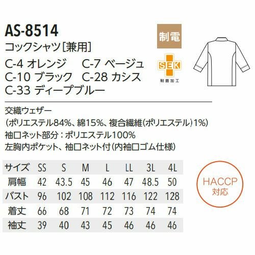 他の画像を見る 制服 ユニフォーム シェフ 接客 チトセ アルベ arbe 七分袖コックシャツ AS-7804 飲食店 厨房服 調理服 レストラン カフェ ベーカリー パン屋 パティシエ おしゃれ かっこいい プロ仕様7分袖 快適 清潔 接客 特別価格 ¥ 4,560 税込 グループごとに色分けできる7色展開。コックシャツに合わせてエプロン、帽子の7色のカラーコーディネートが可能です。 詳細を見る お気に入りに登録する
