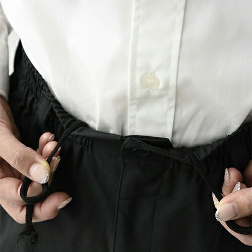 お店の雰囲気がキリリと引き締まる、品よくエレガントなブラックラップキュロット。 フォーマルにだって相性抜群!厚手でしなやか、身体の動きによく馴染むトロマット素材。ウエストに程よくフィットする脇ゴム仕様。