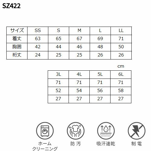 他の画像を見る 白衣 衛生衣 男女兼用 半袖 ジャンパー サーヴォ Servo SZ422 食品衛生白衣 上着 コート 作業着 作業服 制服 ユニフォーム 食品 食品加工 調理 男性 女性 メンズ レディース 制電 吸汗 速乾 高温作業 特別価格 ¥ 3,425 税込 高温作業場向け 涼みドライシリーズ肌離れよく、 ベトつきにくい。点タッチ設計で涼やか 素早く汗を拡散させる高い速乾性。凹凸のある組織で、多面的に汗や水分をキャッチ。素早く拡散・乾燥させ、快適な着心地が続きます。鹿の子ニットで安全・安心・快適。異物や体毛落下を抑制しつつつけ心地にも配慮した設計です。気づき仕様の色付きインナーではみ出し防止。はみ出しがひと目でわかる色付きインナーで正しい着用をサポートします。長め袖丈で多くの人の身体にフィット。従来品より袖丈を長くした仕様で、腕の長い方や身体の大きな方も手首まで袖が届く安全設計です。爽やかで清潔感のあるアイスブルーと清潔でクリーンな印象の上質なホワイトの2色展開。 詳細を見る お気に入りに登録する