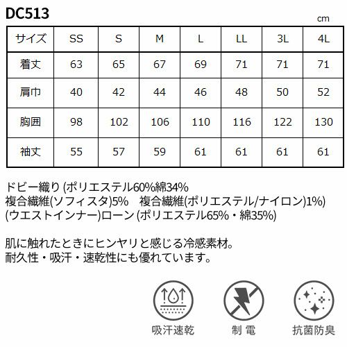 他の画像を見る 白衣 衛生衣 男女兼用 長袖 ジャンパー サーヴォ Servo DC513 食品衛生白衣 上着 コート 作業着 作業服 制服 ユニフォーム 食品 食品加工 調理 男性 女性 メンズ レディース 涼しい 高温作業 特別価格 ¥ 6,417 税込 高温作業場向けAQUQCOOL(アクアクール)シリーズ肌に触れたときに感じるヒンヤリした心地よさ 高い熱伝導率により、肌に触れたときにヒンヤリとした心地良さを感じられます。このクーリング効果が暑い夏にも爽やかさをもたらし、作業効率の向上を期待できます。綿部分で汗や水分を素早く吸収し、ポリエステル部分でサッと乾かす、吸汗・速乾に優れた高機能素材は爽快な着用感です。クラボウ独自の技術“点タッチドライ設計”を採用。生地裏に点タッチの凹凸を施し、肌に接触する面を少なくすることで、肌へのベトつきを軽減します。他の冷感素材にはないヒンヤリとした触感に加え、耐久性、吸汗・速乾性にも優れる高機能素材アクアクールは倉敷紡績株式会社の登録商標です。 詳細を見る お気に入りに登録する