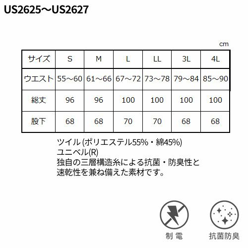 ■抗菌性繊維上の黄色ブドウ球菌の増殖を強力に抑制し、細菌による悪臭も防止。工業洗濯でも機能がほとんど低下せず、衛生的な環境を長く保てます。■素材シワになりにくく丈夫な、ポリエステル/綿の混紡素材を使用しています。■ウエスト胴まわり全体がゴム入りの、総ゴム仕様。調節用の紐コードも入っています。■裾(アンダーカバー)アンダーカバー(内側の布)を靴下の中に入れれば、裾口からの体毛等の落下を防止できます。■ポケット後部右にはマジックテープ留めのポケットが付いています。■内ポケット前部右に内ポケット、腰の中央にカイロ用の内ポケットを設けました。