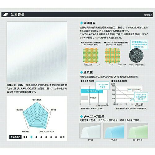 他の画像を見る 食品衛生白衣 衛生衣 作業着 作業服 SZ711 サーヴォ Servo 清潔 衛生 快適 制服 ユニフォーム 食品工場 食品加工 メンズ レディース 高温作業場向け 涼しい 男女兼用ホッピングパンツ 特別価格 ¥ 4,114 税込 高温作業場向け 涼みドライシリーズ肌離れよく、 ベトつきにくい。点タッチ設計で涼やか 素早く汗を拡散させる高い速乾性。凹凸のある組織で、多面的に汗や水分をキャッチ。素早く拡散・乾燥させ、快適な着心地が続きます。鹿の子ニットで安全・安心・快適。異物や体毛落下を抑制しつつつけ心地にも配慮した設計です。気づき仕様の色付きインナーではみ出し防止。はみ出しがひと目でわかる色付きインナーで正しい着用をサポートします。長め袖丈で多くの人の身体にフィット。従来品より袖丈を長くした仕様で、腕の長い方や身体の大きな方も手首まで袖が届く安全設計です。爽やかで清潔感のあるアイスブルーと清潔でクリーンな印象の上質なホワイトの2色展開。 詳細を見る お気に入りに登録する