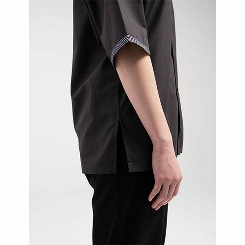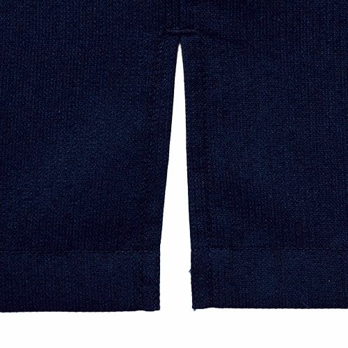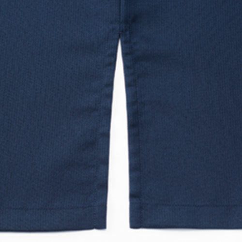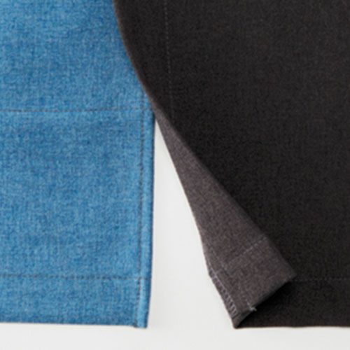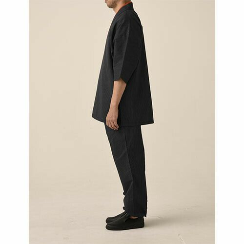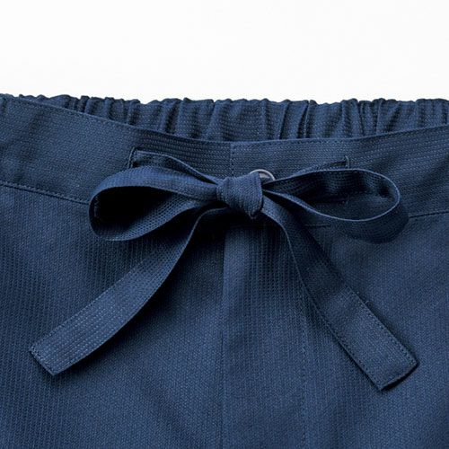 デニム素材の作務衣1枚で、モダンでクリーンな“和”を演出。端正なカジュアルさをもった和アイテム「デニムの作務衣」 洋にも和にも合うデニム素材は、素材の風合いと色によって、カジュアルな中にも少しキリリとした空気を醸します。普通に着るのも良いですが、紐を全て結ばずにさっと羽織るだけでも、デニム素材のおかげで新鮮で格好良い印象になります。エプロンやコートなど、他のアイテムでも使用している、ポリエステル65%・綿35%のオリジナル素材であるデニム生地。その風合いは、デニム素材でありながら、薄手で着心地は軽やか。生デニムの様な濃色で、素材の特性から通常の綿100%デニムと違い、ほぼ色落ちはしません。そのため、いつまでもクリーンな印象を保つことが出来、ホスピタリティのあるユニフォームとして最適な素材です。
