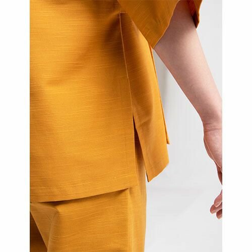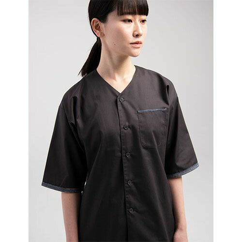 素材感や色あいが、そこはかとなく日本的。織り組織が美しいすだれ織の生地を使ったダボシャツ 活動的で扱いやすい、和風ユニフォームの進化系。織り組織が美しいすだれ織の生地を使ったシャツスタイルのユニフォーム。1枚着るだけで和の雰囲気を醸し出すことができ、着付けやメンテナンスも手間いらず。きものや割烹着以上に幅広い場面で使える商品です。