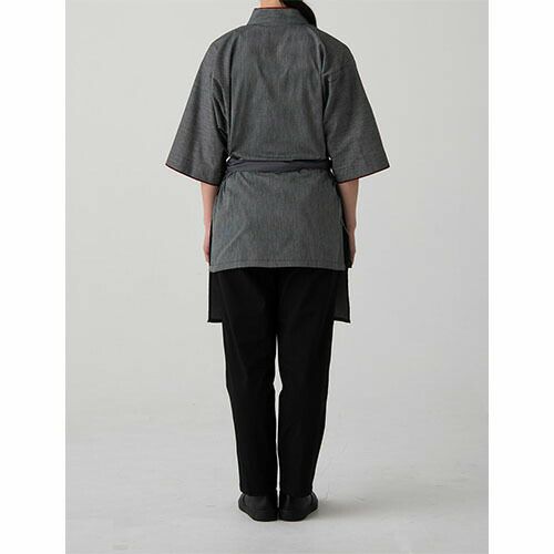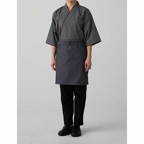 モダンで、かつミニマル。デニム素材の和風コート 薄手のデニム素材で着心地も上質。和風コートの定番に。一着で和を演出できる、便利なアイテム。デニム素材でありながら、その風合いは想像より薄手で着心地は軽やか。生デニムの様な濃色で、素材の特性から通常の綿100%デニムと違い、ほぼ色落ちはしません。そのため、いつまでもクリーンな印象を保つことが出来、ホスピタリティのあるユニフォームとして最適です。