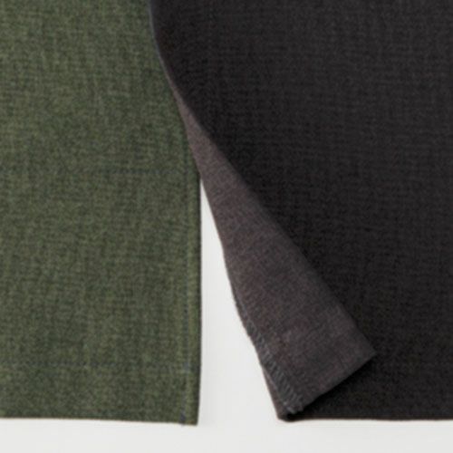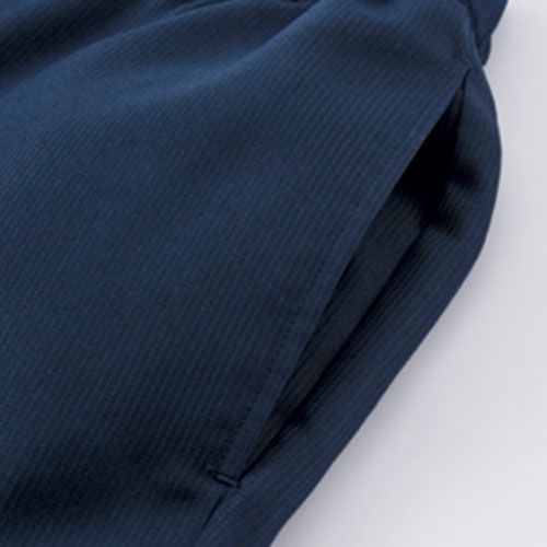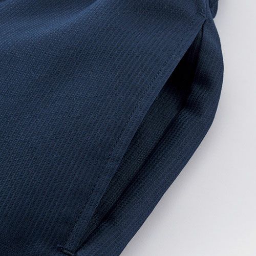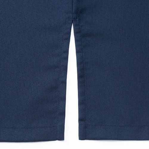 表情と季節感を感じるアイテムをオープンスタイルや和の空間などのサービスシーンに。 涼しげで開放感のある情景を感じられる“しぼ”が特徴的な生地「シアサッカー」シアサッカーは生地表面に凹凸の“しぼ”がストライプ状に現れる様に織られた生地の種類で、肌への接触面が少ないため、通気性がありべたつきにくい生地です。生地表面に独特の表情がある為、とても人気がありますが、ユニフォーム基準をクリアする丈夫なシアサッカー生地は今まで存在していませんでした。1年以上の研究・試作を経て、工業洗濯にも耐えられるユニフォーム素材としてのシアサッカーを開発。風合いは綿リッチで柔らかに、見た目も肌触りも爽やかに仕上がりました。“しぼ”による優しい陰影とカジュアルな表情は癖がなく、どなたでも自然に着こなすことができます。ストレッチ加工も施しているので肘や背中が突っ張ることなく、スムーズに体を動かせるのも特徴です。