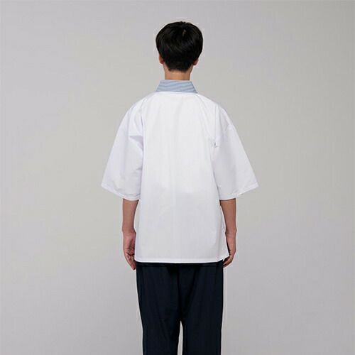 ポリエステルと綿のしっかりした生地で作られた法被(ハッピーコート)です。襟は別布柄配色を施しさわやかな印象を与えます。色、柄がありますのでカジュアルさ、活気あるシーンなどにオススメです。内側を紐で結び、外側でも紐を結んで着用する仕様です。左胸内側にポケットあり。脇の裾にスリットありますので動き易いです。袖は5分丈。
