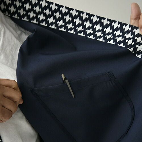 ポリエステルと綿のしっかり厚みのある生地で作られた法被(ハッピーコート)です。襟は別布柄配色を施し賑やかな印象を与えます。色、柄がありますのでカジュアルさ、活気あるシーンなどにオススメです。内側を紐で結び、外側でも紐を結んで着用する仕様です。左胸内側にポケットあり。脇の裾にスリットありますので動き易いです。袖は5分丈。