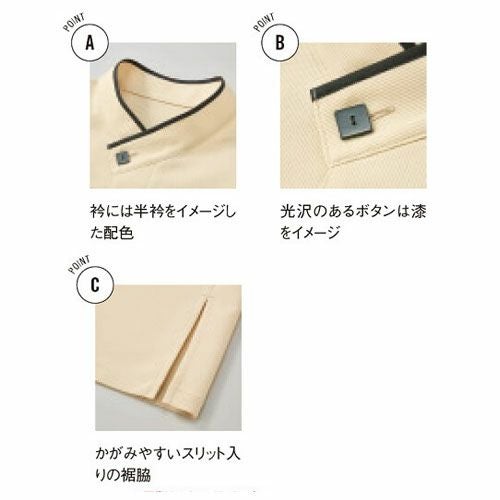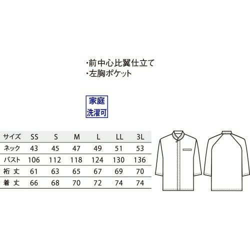 他の画像を見る シャツ 和風 制服 ユニフォーム 七分袖 SBLU-1815 サーヴォ Servo 7分袖 男女兼用 カジュアル 飲食店 メンズ レディース 居酒屋 蕎麦屋 そば屋 うどん屋 屋台 ラーメン屋 おしゃれ かわいい かっこいい シンプル ショップコート 特別価格 ¥ 5,362 税込 和風のシンプルな七分袖のショップコート。 細かい畝織になったニュアンスのある素材を使用しています。衿端に半衿をイメージした黒の配色、漆器のようなボタンがアクセントです。前開きは比翼ボタン仕立てで作業の邪魔になりません。袖下にはマチが入っていて動きやすいパターン、左胸にはパッチポケットが付いています。両脇裾にはスリットを入れ、様々な動作をスムーズにします。グレー・ベージュ・紺の3色展開です。 在庫切れ 詳細を見る お気に入りに登録する
