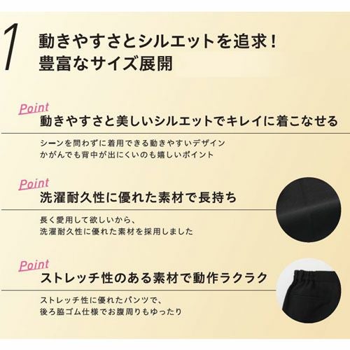 他の画像を見る パンツ スラックス ズボン 制服 ユニフォーム FP5432 サーヴォ Servo フォーマル カジュアル オフィス 飲食店 レディース レストラン カフェ おしゃれ かっこいい ストレッチ 女性用 黒 特別価格 ¥ 5,270 税込 ストレッチ素材でストレスフリーの着心地。 レストランからカフェまで、もっとも多く使われるレディスブラックパンツ。その着心地にこだわりました。ウエスト両脇に内蔵したパワーゴムで立ち座りがとても楽です。キチンとした雰囲気もお客様から好評です。 詳細を見る お気に入りに登録する