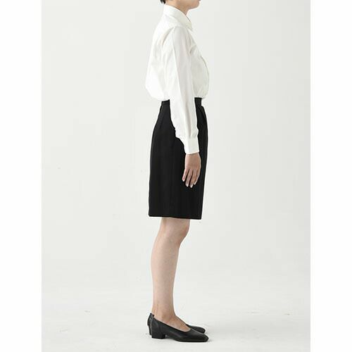 ポリエステル100%ながら毛混同等の高級感ある素材の膝上スカートです。ヒップはゆとりあるコクーン型シルエットですので、比較的色々な体型の人にフィットしやすい。後ろにベントがありますので動き易く、上衣は定番のジャケットからイートンコートまで、色々なタイプのものと合わせやすくなっています。