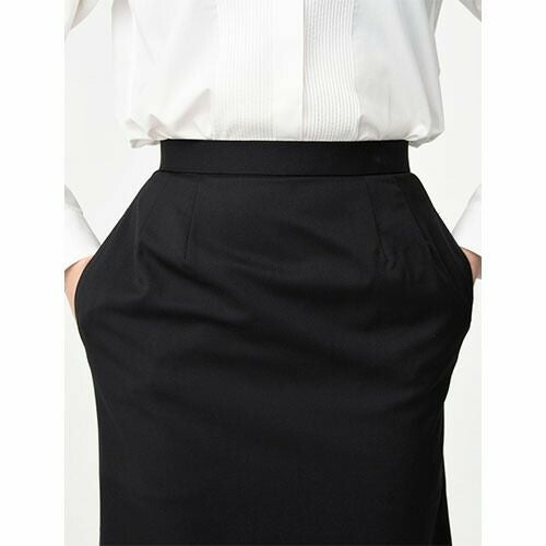経年退色、色落ち、耐光劣化がない“黒”定番エプロン・パンツを新開発 ユニフォームパンツの定番、黒。しかし現場では塩素漂白や耐光などにより色持ちがしにくいことが課題となってきました。新開発の「エバーブラック シリーズ」は、経年退色、塩素漂白の色抜け、耐光劣化がない素材を糸作りから考えたアイテム群。原料段階に着色する原着糸の採用で根本的にほぼ色落ちすることのない生地を開発し、塩素を使った清掃等で、ユニフォームの色抜けが問題となることが多いサービスシーンの要望に応えました。原料段階に着色する原着糸を使用した生地生地はラチネ組織の使用で、ポリエステル100%ながら光沢を抑え、梳毛スーツ地のようななめらかで高級感のある風合いに仕上がっています。ストレッチ性も高く、活動量の多い現場でも着用の美しさと機能面の両方をカバーすることが出来ます。製造工程での水・エネルギーの使用量も少なく、長期使用が可能なことでも環境への負荷が少ない製品です。パンツは定番の黒パンツをシルエットはそのままに、ポケット位置などを細かく修正しています。既存商品を使って頂いている現場には、サイズ感そのままで切り替え運用が可能です。スーツパンツのような見た目から、コロナ禍でマルチタスク化したホテルスタッフや、タクシー運転手などのように太陽光に長時間当たる外での業務にも広く使って頂けます。エプロンも全て定番の形をベースに、ものをたくさん入れられるようポケットはマチ付きに改良。軽くてストレッチ性の高い素材のため、着用感も軽く、着丈の長いエプロンも足さばきが良いのが特徴です。