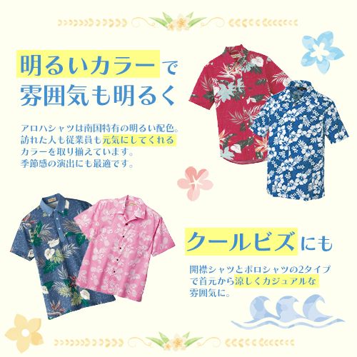 他の画像を見る 【メール便対応】アロハシャツ 制服 ユニフォーム ハイビスカス 総柄 男女兼用 メンズ レディース 飲食店 ビアガーデン レストラン ハワイアン 南国料理 カジュアル 半袖 柄シャツ 夏 海 開襟シャツ ゆったり 涼しい おしゃれ 大きいサイズ 特別価格 ¥ 2,444 税込 〜 特別価格 ¥ 税込 夏のイベント、飲食店にピッタリのアロハシャツ。祭りや飲食店にも! 様々なシーンで活躍する明るい雰囲気が特徴です 詳細を見る お気に入りに登録する