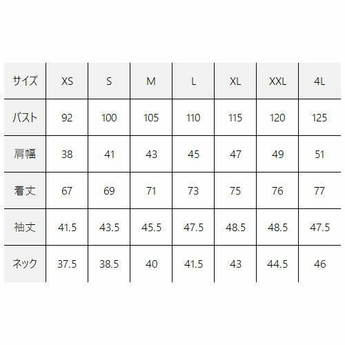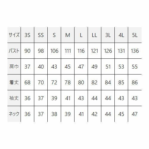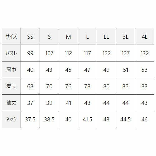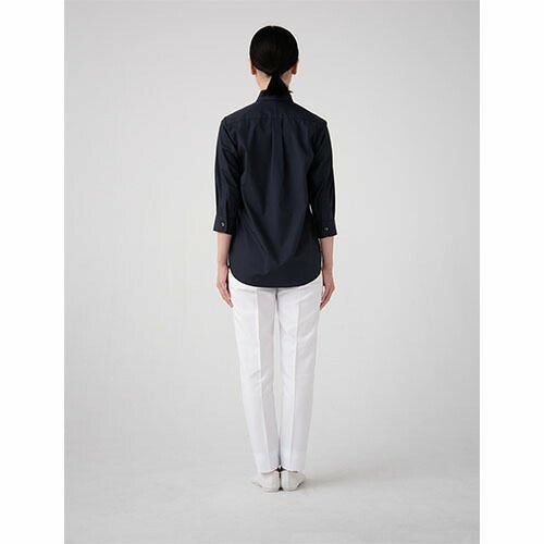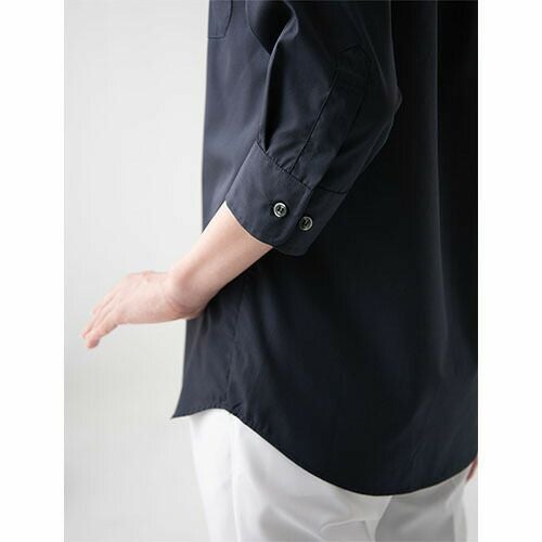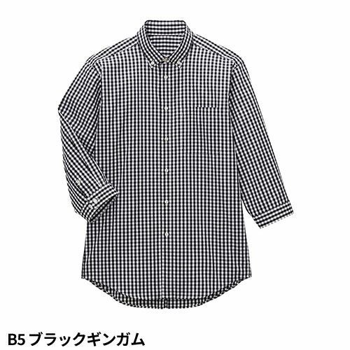 黒いボタンがアクセントのベーシックな七分袖シャツ。幅広い業態にマッチし、SS~4Lとサイズ展開も豊富です。