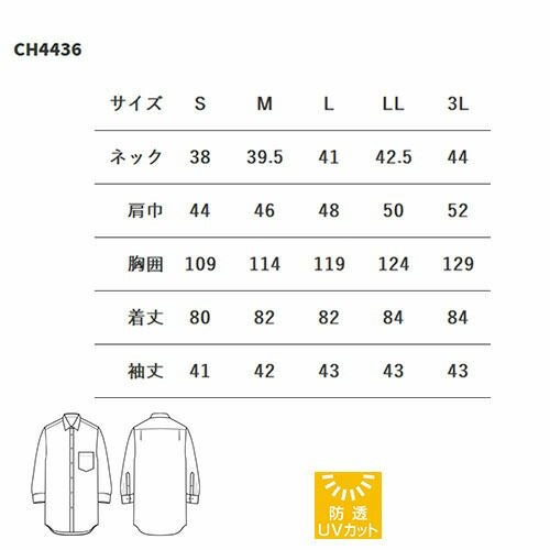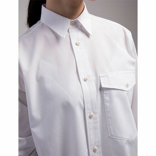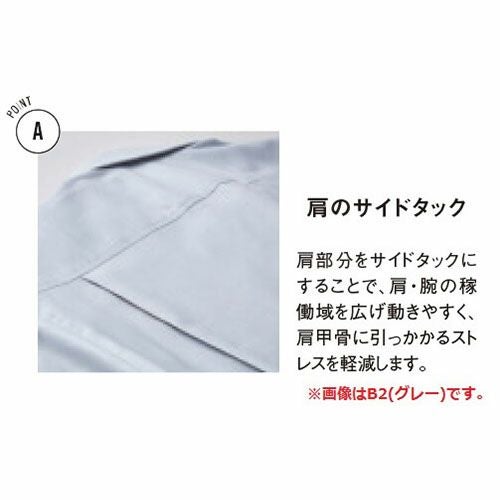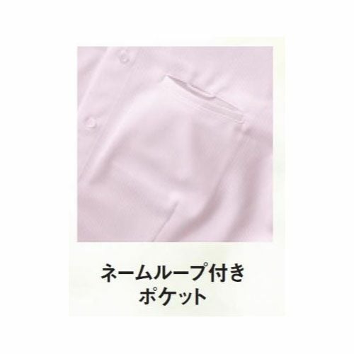 おもてなしに不可欠な清潔感に防透・防汚の機能をプラス すっきりとしたシルエットのボタンダウン。胸元には切替利用ポケット付き。後ヨーク切替下の両サイドにタックを入れ、動きやすい工夫を。汚れを押し上げ、落ちやすくする「ステインオフ加工」付き。東レの“ナノマトリックス”技術により、繊維と親和力の高いSR剤を被膜化。SR剤が洗液中で膨潤し、汚れを押し上げ、落ちやすくします。