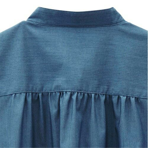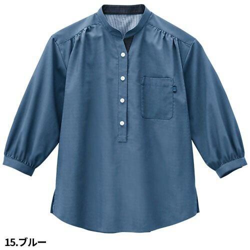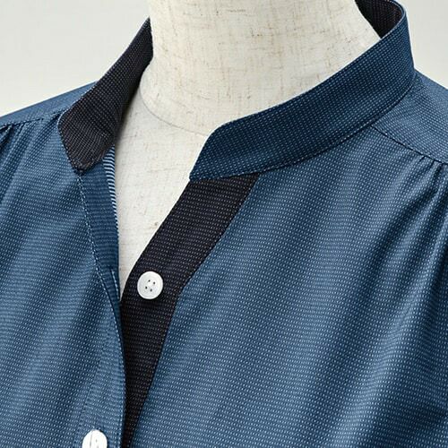 低めのスタンドカラーの女性用プルオーバーシャツ 顔周りがスッキリ見えるおしゃれな衿元のデザイン。下前立ての配色もアクセント!パフスリーブやギャザーを可愛く取り入れています。