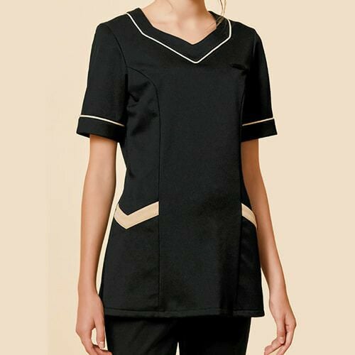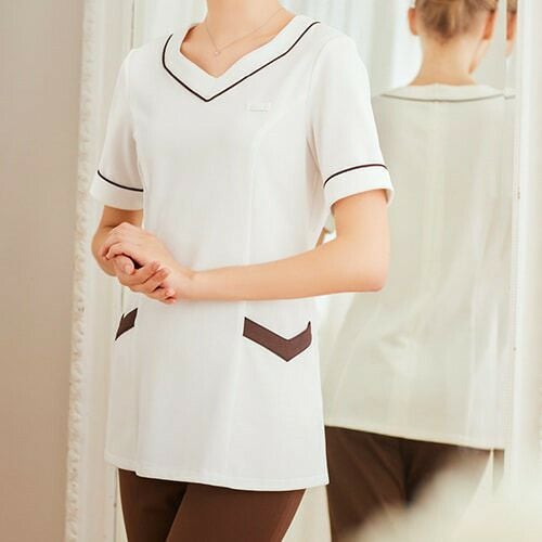「美」と「癒やし」を求めるお客様をお迎えするために「美しさ」と「きれい」は大切なキーワード。それは、華やかさであり清涼感があることです。また、「優しく」洗練されたデザインスタイルで、「しなやかに」スムーズな機能性と素材でお応えします やさしさと洗練されたイメージのチュニックスタイル。清涼感と着心地にこだわりました