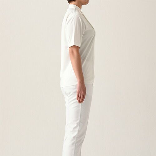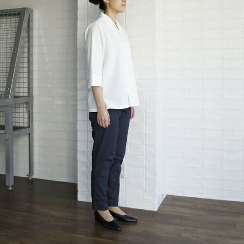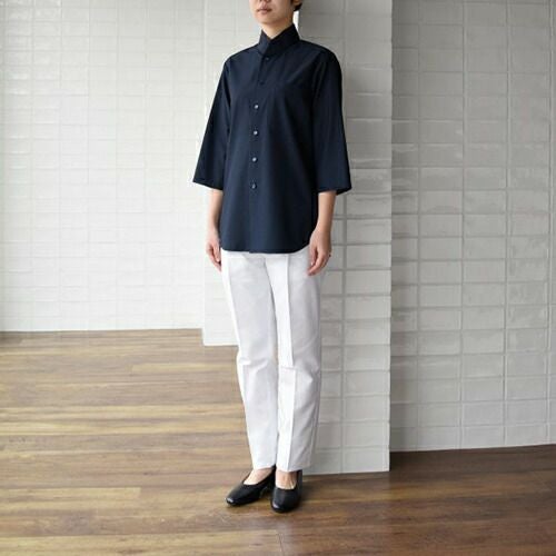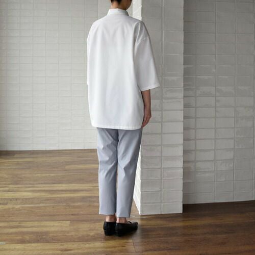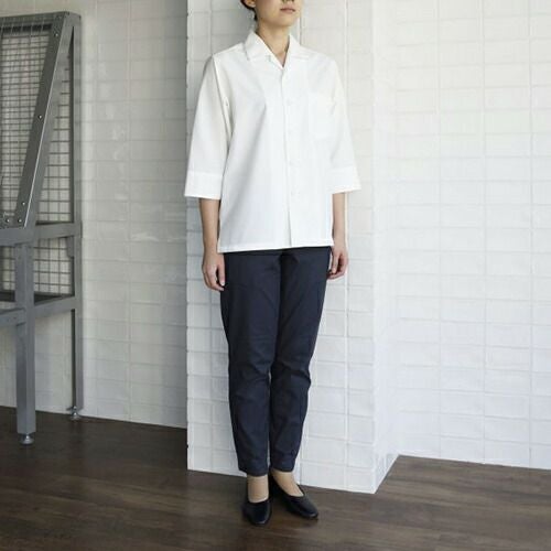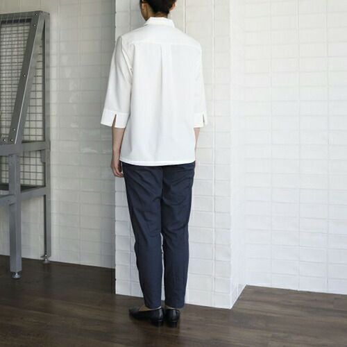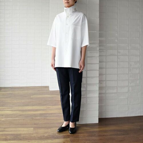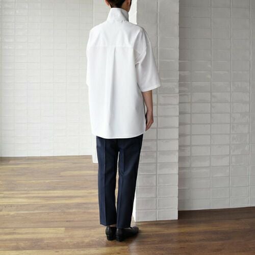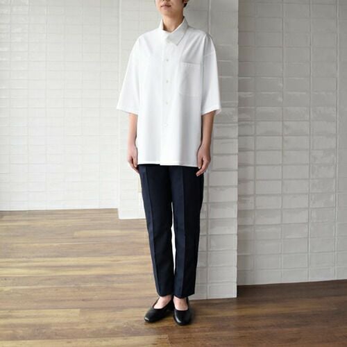 定番人気シャツが滑らかな動きを叶えるコンパクトなフォルムにリニューアル! 汎用性の高い定番の半袖ブラウス。オフ白、台衿付きシャツカラーです。左胸にパッチポケット、前立て下部に替えボタン付き。
