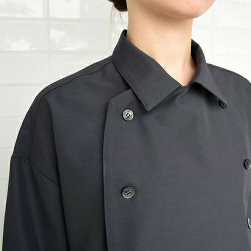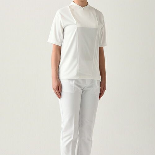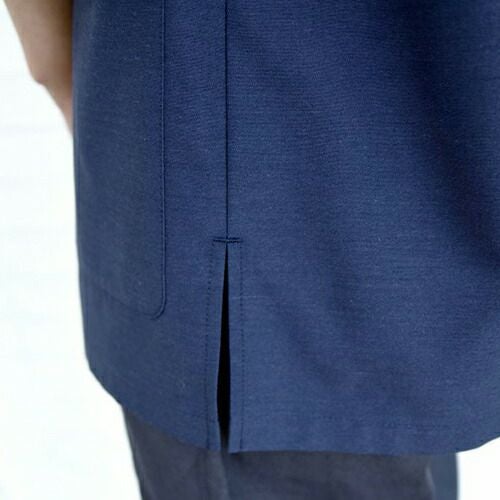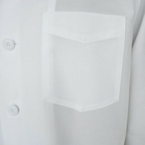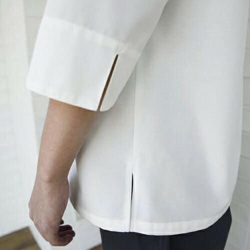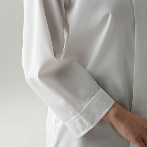 活動的な7分袖と長めの着丈。エレガントさを演出しつつ軽やかに。コートの常識を覆す、薄く滑らかな「シャツ地の7分袖シャツコート」 軽やかさが最大のポイント、美しい佇まいのユニフォームです。「シャツ地の7分袖シャツコートシリーズ」は、通常シャツに用いる生地をコートに仕立てました。シャツ生地の中でも特に薄手でシルクの様に滑らかなブロードという生地を採用。細く長いシルクライクな糸によるきめ細かな織で毛羽立ちが少なく、さらりとした肌触り。ごわつきはありません。シャツ生地ですが防透・UVカット加工を施しているので、薄手でも肌着が透ける心配もなく、夏場や暑い場所でも安心です。特徴的なのは生地だけではありません。シルエットにもこだわりました。全3型の袖はどれも7分の長さでスッキリと、着丈はお尻が隠れるくらい長めで、エプロンでウエストを締めても背中が覗く心配はありません。肩幅・身幅、袖口をそれぞれゆったりめに作ることでエレガントさを演出しつつ、生地の滑らかさと相まって見た目も着心地も軽やかに仕上がりました。