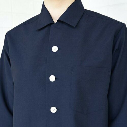定番シンプルなブラックシャツをより動きやすくスマートにブラッシュアップ 汎用性の高い定番の長袖シャツ。左胸にパッチポケット、袖口カフスにはサイズ調節できるように2つボタンが付いています。前立て下部には替えボタン付き。
