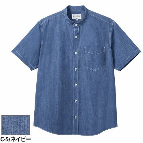 従来の和洋の枠を超えた、新たな「おもてなし」スタイル 白いダブルステッチとバンドカラーが印象的。お店に爽やかな雰囲気を与えるダンガリーシャツ。
