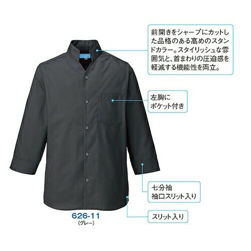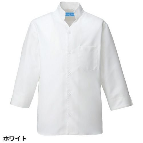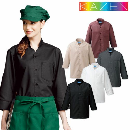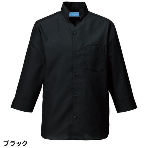 白シャツ ホワイト 黒シャツ ブラック スタンドカラー 立ち襟 制服 ユニフォーム KAZEN カゼン 七分袖 男女兼用 626 -05 ~ -18 飲食店 メンズ レディース レストラン カフェ 厨房 中華 おしゃれ かわいい かっこいい 透けにくい 乾きやすい