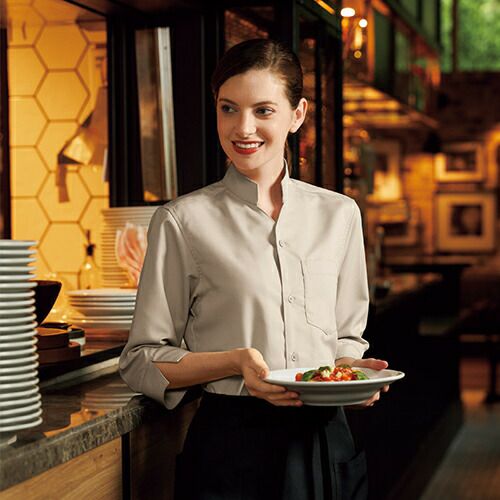 おもてなしに不可欠な清潔感に防透・防汚の機能をプラス すっきりとしたシルエットのボタンダウン。胸元には切替利用ポケット付き。後ヨーク切替下の両サイドにタックを入れ、動きやすい工夫を。汚れを押し上げ、落ちやすくする「ステインオフ加工」付き。東レの“ナノマトリックス”技術により、繊維と親和力の高いSR剤を被膜化。SR剤が洗液中で膨潤し、汚れを押し上げ、落ちやすくします。