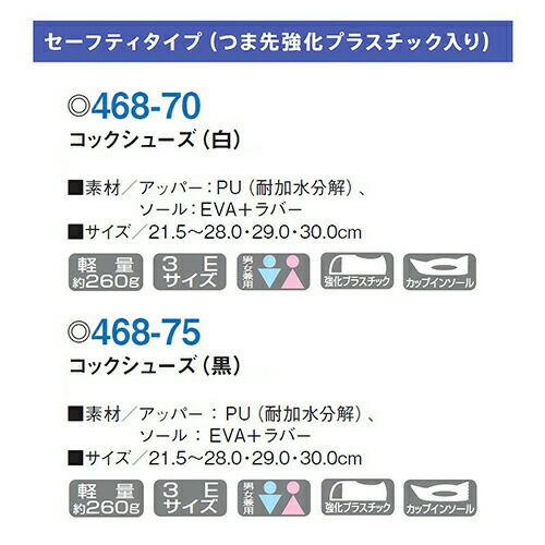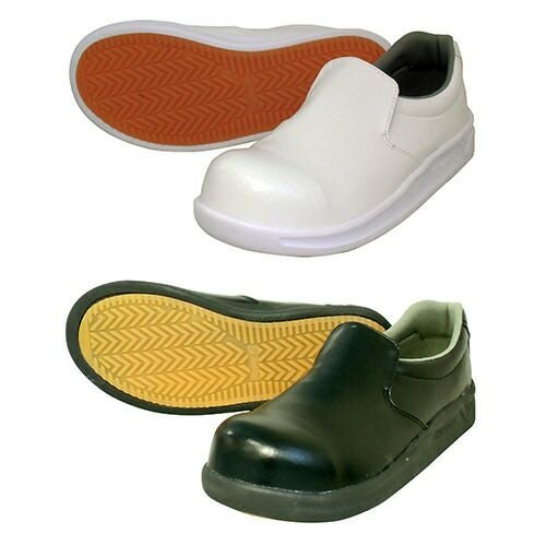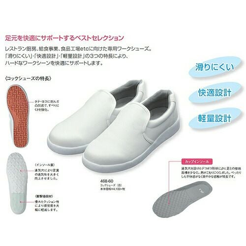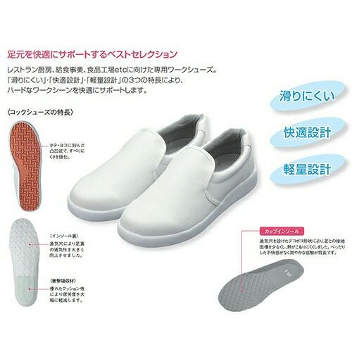 かかとが低いサボシューズを選ぶことで脱ぎ履きもスムーズにできますので、頻繁に小上がりへと上がる給仕の方にもおすすめです。ハイパーVソールのものは濡れた床でも強いグリップ性で滑らないで安心して歩行できます。当店で扱っているシューズにはサボシューズ、セーフティーシューズ、安全シューズ、スリッポン、スニーカー、ローカット、サンダルなどを取り扱っています。一般的な量販店ではどこに売ってるかわかりにくい厨房シューズもまもる君で取り扱っております。一般的なスニーカーや長靴、ワーキングシューズと異なり、厨房靴は油や水に強いことが特徴です。厨房シューズとも呼ばれ、厨房・キッチンでコック、料理人、調理担当者が履く靴を指します。飲食店などの厨房で働く人のための作業靴なので、油や水が飛び散り、滑りやすくなっている床であってもしっかりと歩けるように靴底に溝がしっかりとつけられており、滑りにくさを重視した機能性のシューズであることが最大の特徴です。飲食は基本的に立ち仕事が多いため、厨房シューズ・コックシューズも疲れにくいように設計されています。ソフトなクッションが中に仕込まれているもの、靴底がエアクッションなどの分厚くてやわらかい素材であるもの、足裏に優しくフィットしてくれるものなど様々な種類があります。まもる君のレディース メンズ 厨房靴は先芯ありと無しから選べ安全靴としてもお使いいただけます。シューズの先に硬い芯が入っているものは包丁などの危険物や重い鍋の落下などからつま先を守られる安全性を重視したシューズです。厨房シューズには水などの侵入を防ぐため穴がないことが多く、生地も水に強い素材を使用するためこの側面からも油や水に強いといえます。雨などの侵入も防ぐため、ガーデニングやDIYといった屋外作業の際の靴として使われることもあります。カラーバリエーションは少ないですが、黒を選ぶと汚れやすいキッチンであっても汚れが目立ちにくく、すぐにホールに出てきて使うことができるのでおすすめです。デザインもシンプルなため、様々な飲食店ユニフォームに合わせやすく、服装や年齢を問わず誰でもお使いいただけます。どこで買えるかわかりにくい厨房シューズ・コックシューズ・キッチンシューズもまもる君ではレディース メンズ ユニセックス 男性用 女性用 男女兼用 など各種アイテムを取り揃えております。