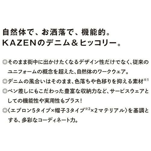 他の画像を見る 【メール便対応】エプロン 前掛 ミドル丈 KAZEN カゼン ミドルエプロン APK783-98 飲食店 制服 ユニフォーム カフェ レストラン バー 居酒屋 ソムリエ 保育士 キッチン 厨房 デニム 実用的 おしゃれ かわいい 可愛い かっこいい メーカー希望小売価格 ¥ 5,830 特別価格 ¥ 4,680 税込 色落ちしにくい次世代デニム素材を採用!デニムが擦れたときのような色移りもしにくく環境にやさしいエコロジー素材です。 十分な収納力でサービスウェアとしての機能性や実用性をプラスしました。エプロンと同素材の帽子をかぶれば多彩なコーディネートも可能です。 詳細を見る お気に入りに登録する