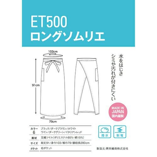 他の画像を見る 【メール便対応】エプロン 前掛 制服 ユニフォーム ロング丈 長め 興栄繊商 KOEI ロングソムリエ LET500、LET500-WI、LET500-GR、LET500-RE 飲食店 ユニフォーム カフェ レストラン バー 居酒屋 ソムリエ おしゃれ かわいい 可愛い かっこいい業務用 シンプル 定番 特別価格 ¥ 2,160 税込 シミやほこりが付きにくい定番ロングソムリエ シミやほこりが付きにくい、人気の定番スタイル。ポケットは右に1つ付いています。素材に綿を混ぜることで腰ひもがしっかり結べ、快適にお仕事ができます。 詳細を見る お気に入りに登録する