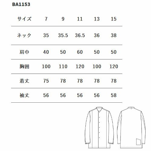 セブンユニフォーム 業務用 白シャツ ホワイト シャツ シャツコート 襟無し 長袖 BA1153 男女兼用 メンズ レディース 吸水 速乾 ストレッチ 動きやすい おしゃれ 飲食店 制服 ユニフォーム レストラン カフェ かわいい かっこいい 老舗