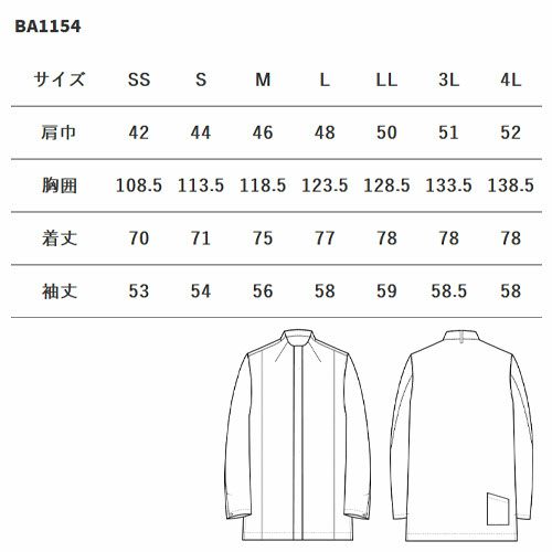セブンユニフォーム 業務用 白シャツ ホワイト シャツ シャツコート 襟無し 長袖 BA1154 男女兼用 メンズ レディース 吸水 速乾 ストレッチ 動きやすい おしゃれ 飲食店 制服 ユニフォーム レストラン カフェ かわいい かっこいい 老舗