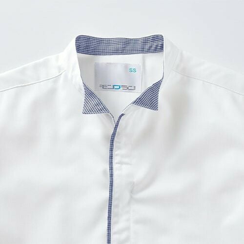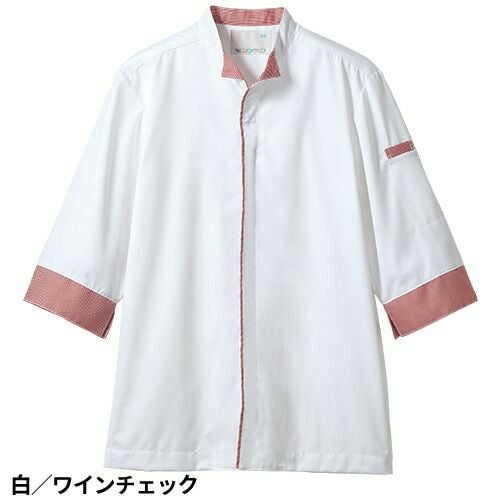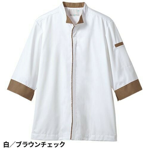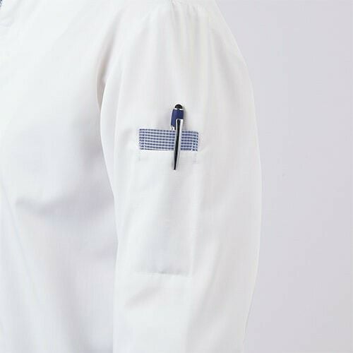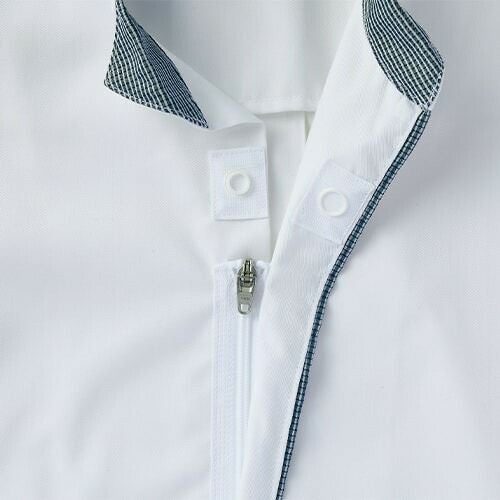 デザインはよりおしゃれに、衛生機能はより専門的に進化した白/ブルーチェックの調理コート。 七分袖の男女兼用調理コート。体毛の落下を防止する袖口ネット付き。左袖にペン差しポケット。動きやすさをサポートする背面プリーツ。破損しにくいスナップ・ファスナーで破損による異物落下を防止。襟裏に濃色を配色することで襟裏汚れの目立ちをカバー。